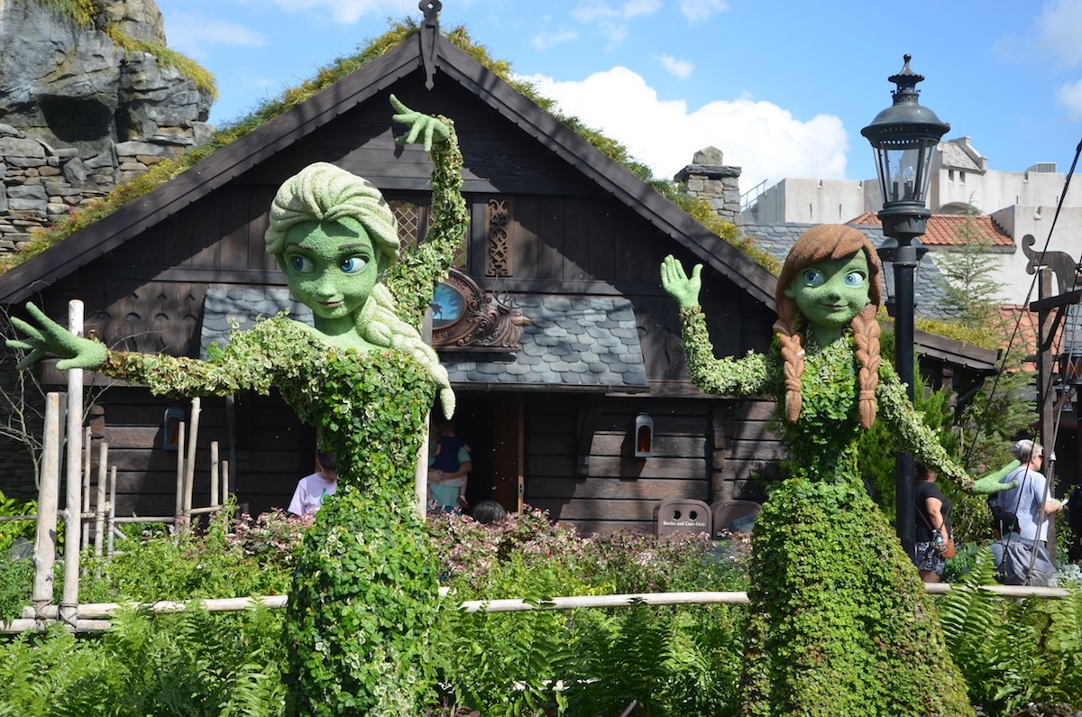 Elsa and Anna topiaries from the 2018 Epcot International Flower and Garden Festival.5. The Anna and Elsa topiaries stand 6.5 feet tall and are created with plants that include variegated Ficus, green Ficus and the succulent Sedum Coral Reef.
